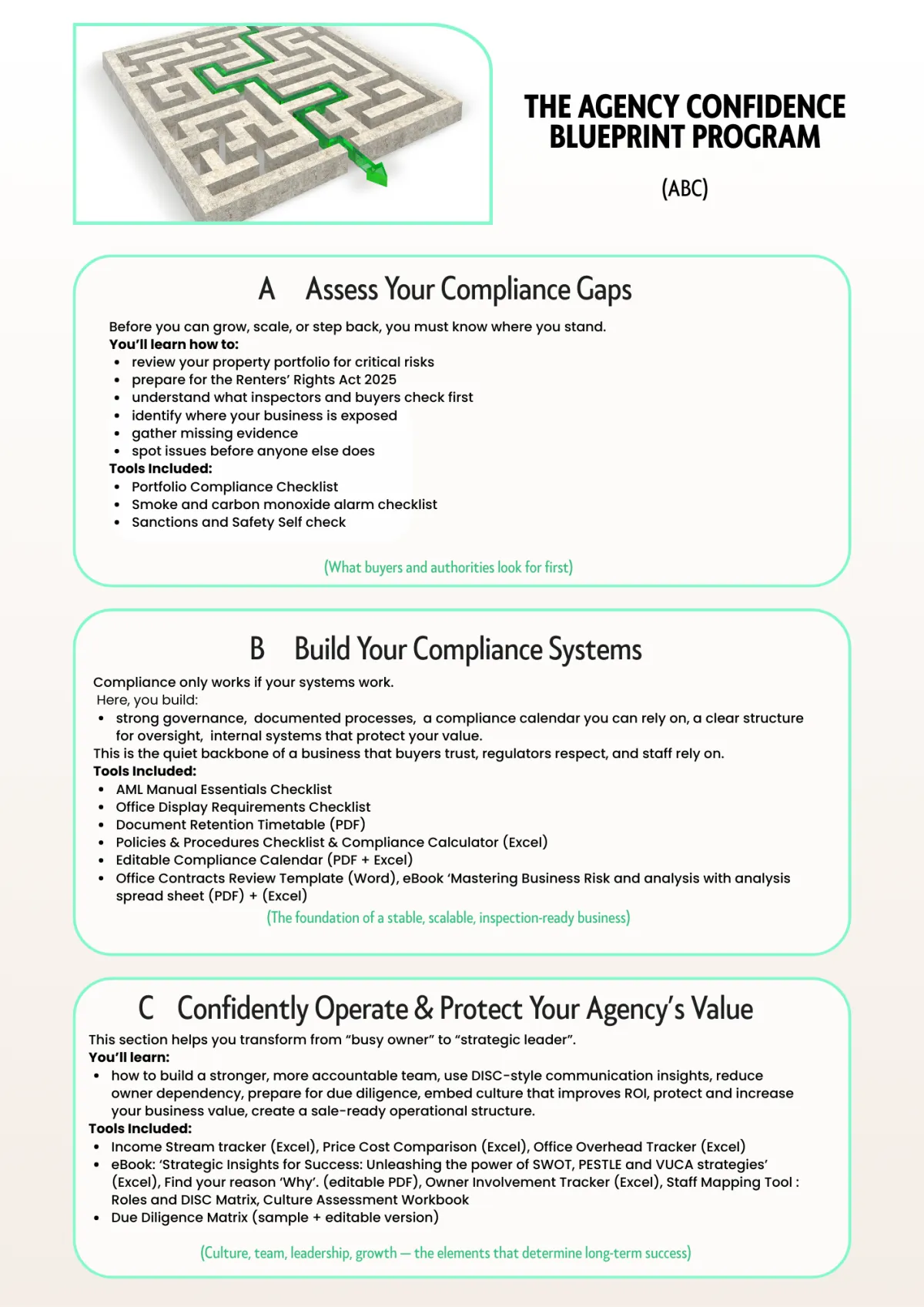 Start with our Red Flags for Buyers PowerPoint (4 hours/sessions) for an overview on all things compliance. Perfect for Agency owners / Managers who want a quick, clear overview of compliance essentials.